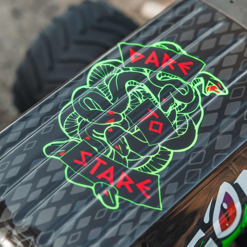 When you're blasting with the ARRMA GORGON MT monster truck, all eyes will be on you — and on its "fang-tastic", factory-finished trim scheme. The GORGON MT RTR is available in red or fluorescent yellow, with color-coordinated shock springs, battery tray, skid plates, and front and rear bumpers. A quick-release mechanism lets you get under the body in seconds for super-easy maintenance.